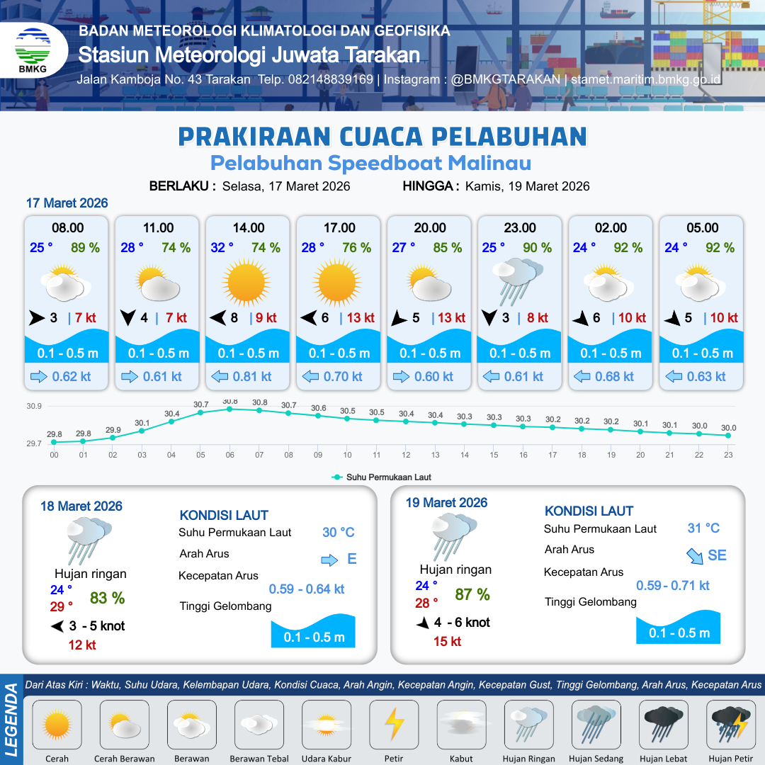16 Mar 26, 12.00 9 jam yang lalu | Cerah Berawan | Timur 8 kt Gust Peningkatan kecepatan angin yang singkat dan tiba-tiba : 10 kt | | | 10 km | 27 °C | 73 % | +0.47 m |
