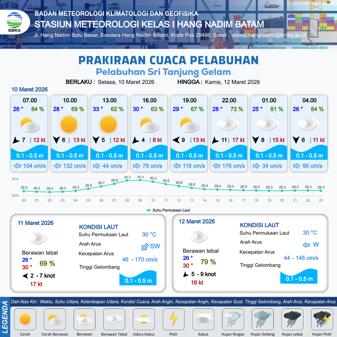 9 Mar 26, 04.00 13 jam yang lalu | Berawan | Timur Laut 7 kt Gust Peningkatan kecepatan angin yang singkat dan tiba-tiba : 14 kt | | | 10 km | 29 °C | 73 % | +0.30 m |