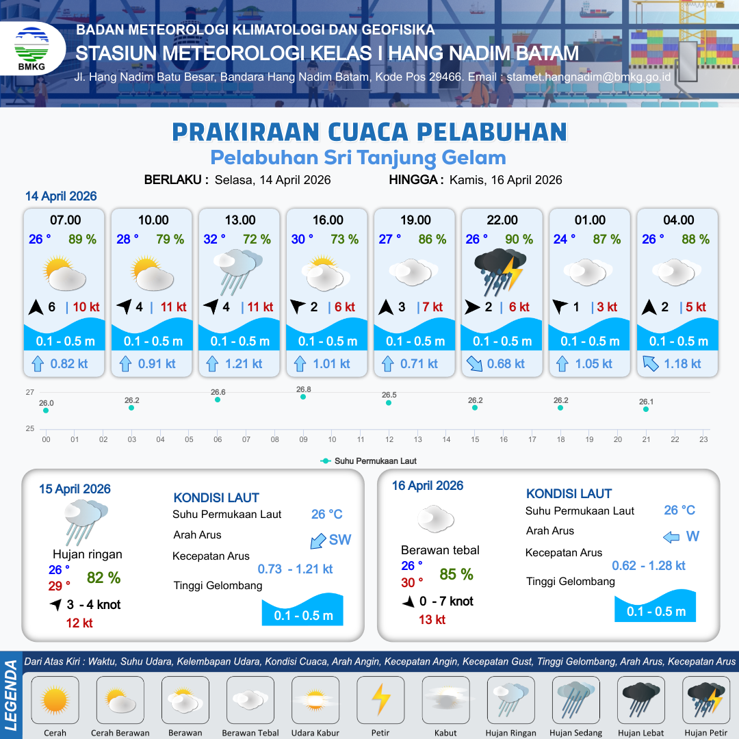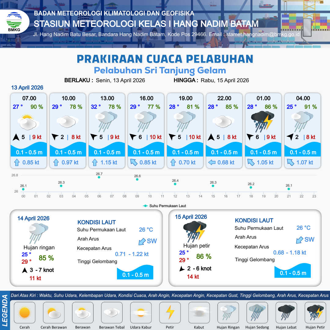 13 Apr 26, 23.00 3 jam kedepan | Hujan Ringan | Selatan 7 kt Gust Peningkatan kecepatan angin yang singkat dan tiba-tiba : 7 kt | | | 6 km | 26 °C | 89 % | +0.48 m |