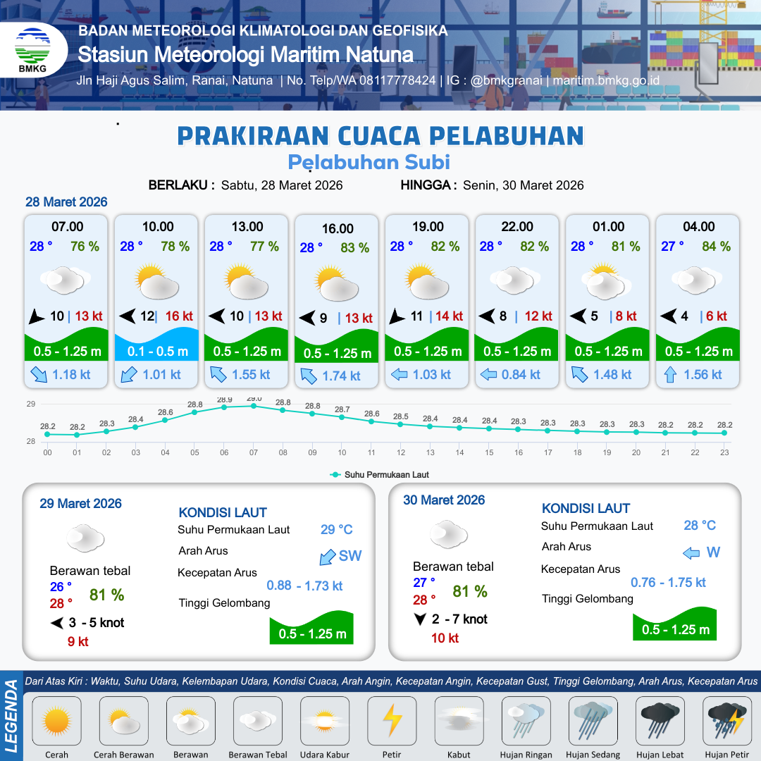 28 Mar 26, 13.00 3 jam kedepan | Timur Laut 11 kt Gust Peningkatan kecepatan angin yang singkat dan tiba-tiba : 14 kt | 0.7 m Rendah | Barat 0.9 Knot | 10 km | 28 °C | 82 % | +0.22 m | |