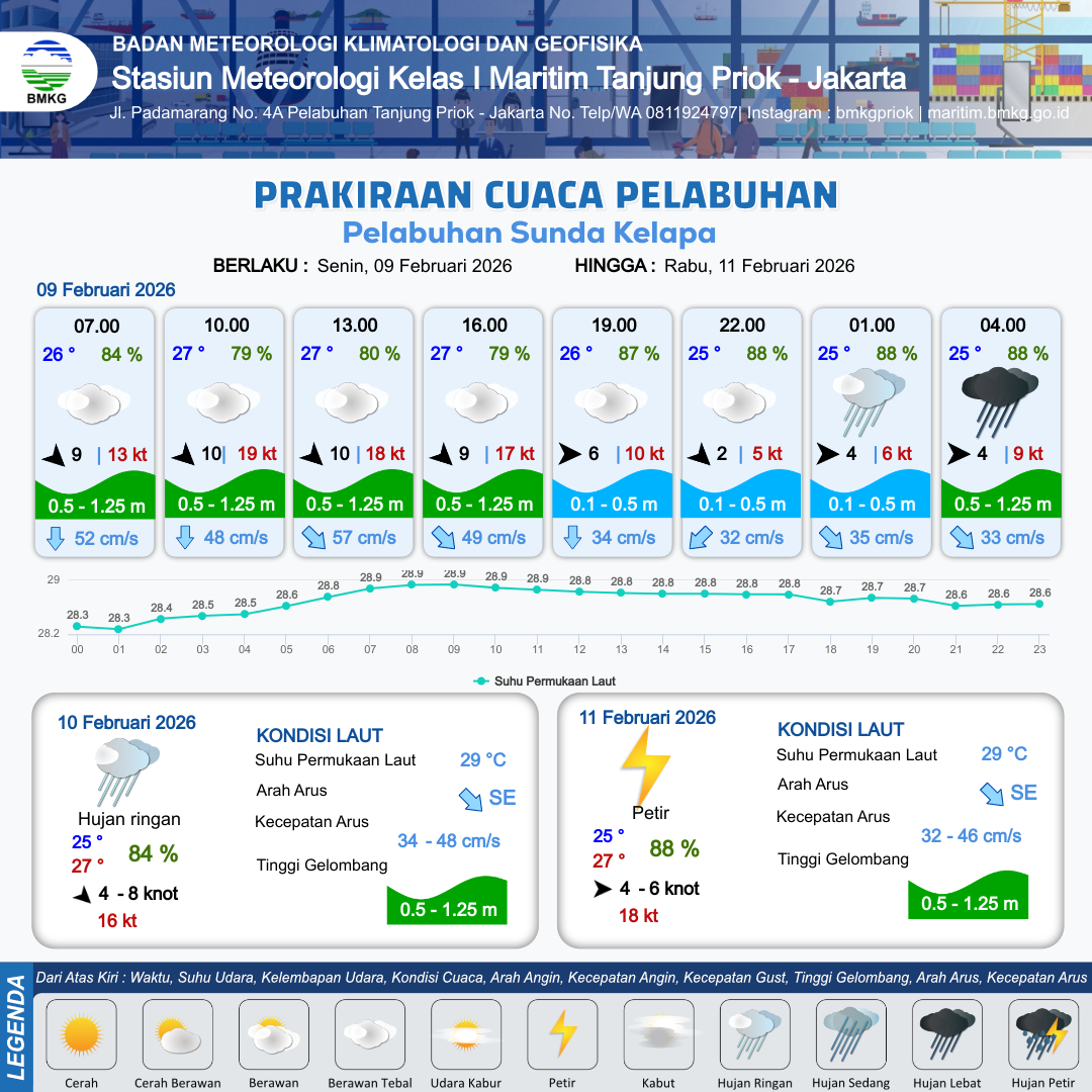 9 Feb 26, 22.00 14 jam kedepan | Barat 4 kt Gust Peningkatan kecepatan angin yang singkat dan tiba-tiba : 10 kt | 0.5 m Rendah | Barat Laut 33.0 cm/s | 3 km | 25 °C | 90 % | +0.30 m | |