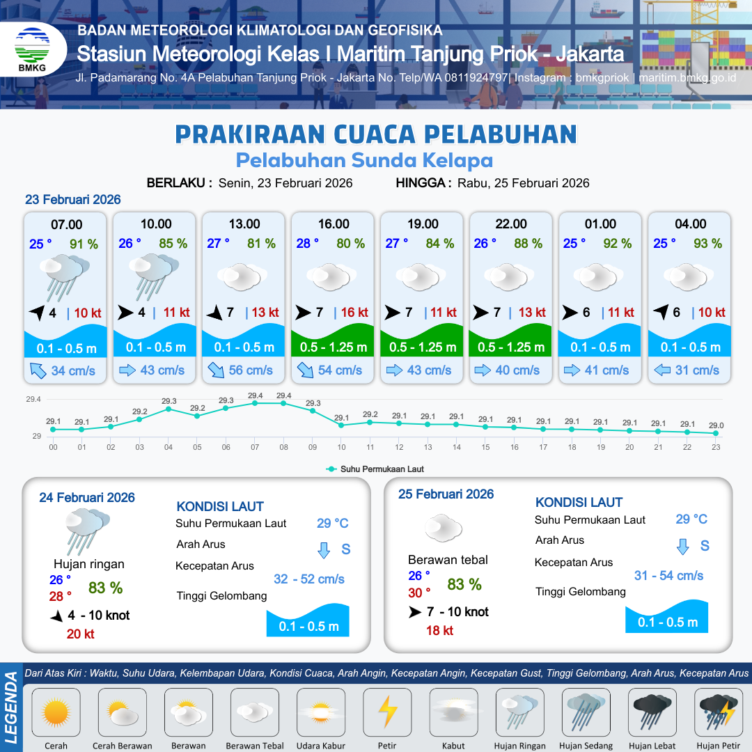 23 Feb 26, 12.00 3 jam kedepan | Barat 7 kt Gust Peningkatan kecepatan angin yang singkat dan tiba-tiba : 11 kt | 1.1 m Rendah | Timur 43.0 cm/s | 10 km | 27 °C | 84 % | -0.07 m | |