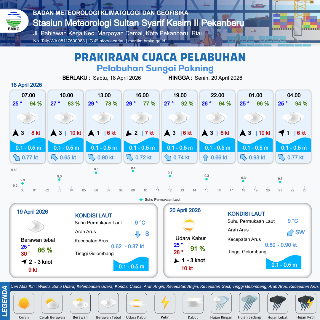 18 Apr 26, 11.00 2 jam kedepan | Selatan 3 kt Gust Peningkatan kecepatan angin yang singkat dan tiba-tiba : 6 kt | 0.3 m Tenang | Tenggara 0.7 Knot | 8 km | 27 °C | 88 % | +0.20 m | |