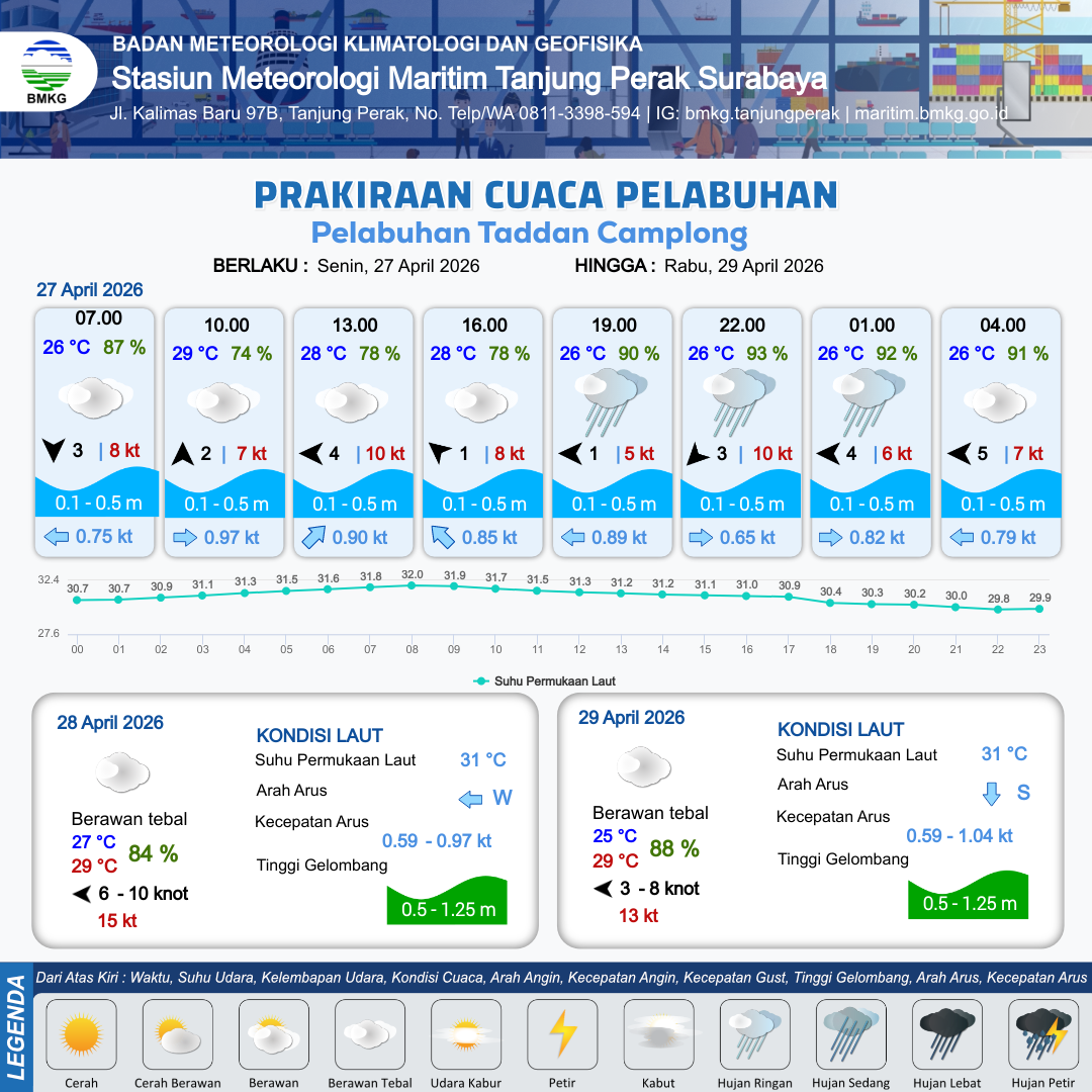 27 Apr 26, 23.00 16 jam kedepan | Timur 7 kt Gust Peningkatan kecepatan angin yang singkat dan tiba-tiba : 9 kt | 0.5 m Rendah | Barat 0.9 Knot | 10 km | 26 °C | 90 % | -0.15 m |