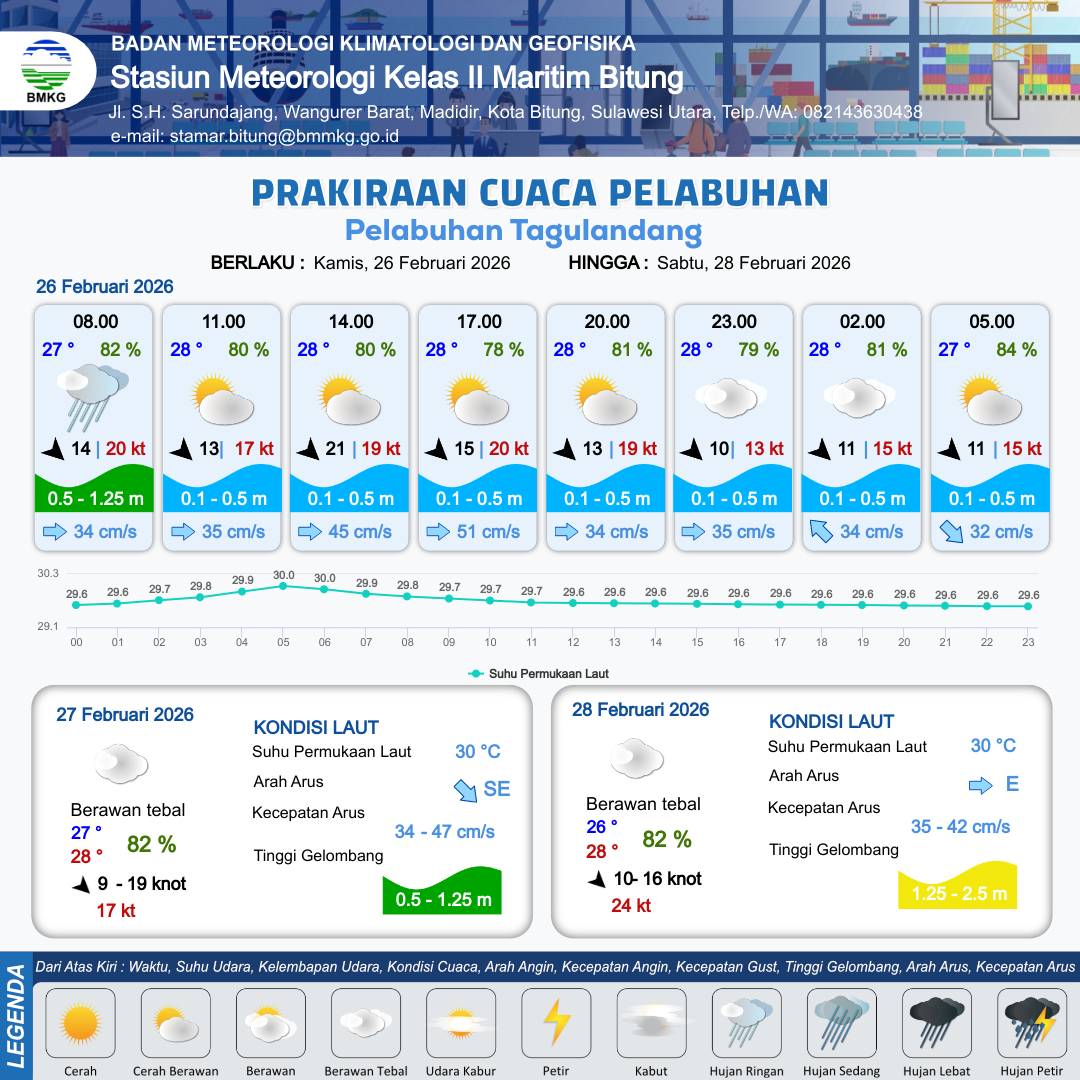 26 Feb 26, 06.00 12 jam yang lalu | Cerah Berawan | Barat Laut 21 kt Gust Peningkatan kecepatan angin yang singkat dan tiba-tiba : 19 kt | | | 10 km | 28 °C | 80 % | +0.36 m |