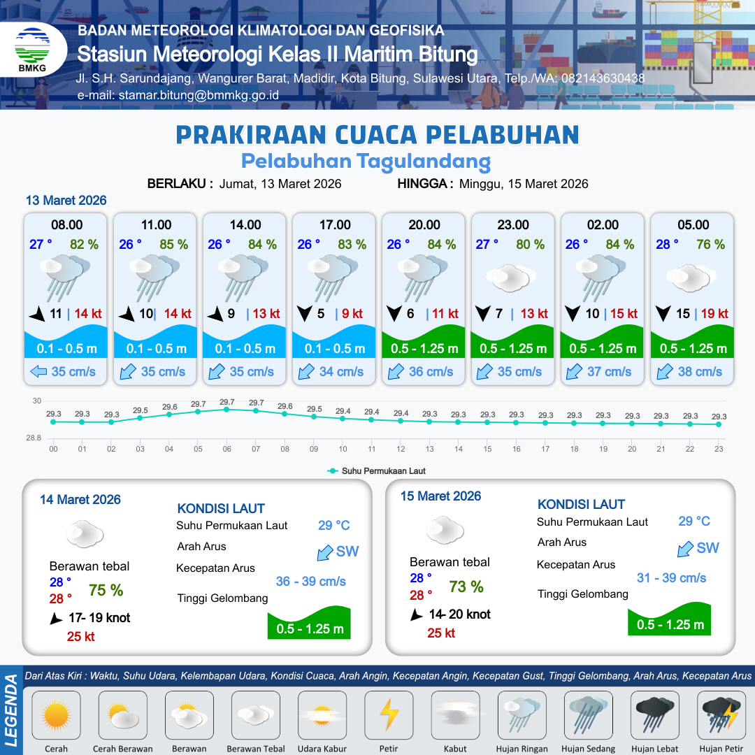 12 Mar 26, 05.00 14 jam yang lalu | Berawan Tebal | Barat Laut 13 kt Gust Peningkatan kecepatan angin yang singkat dan tiba-tiba : 16 kt | | | 9 km | 27 °C | 81 % | +0.15 m |