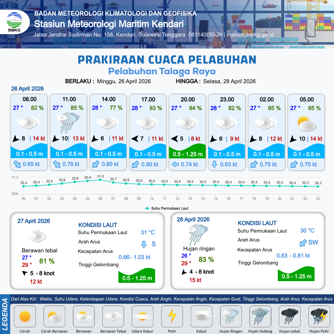 25 Apr 26, 23.00 5 jam kedepan | Cerah Berawan | Timur 2 kt Gust Peningkatan kecepatan angin yang singkat dan tiba-tiba : 9 kt | | | 10 km | 26 °C | 84 % | +0.38 m |