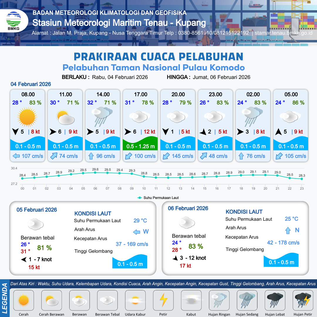 4 Feb 26, 10.00 8 jam yang lalu | Berawan | Barat 6 kt Gust Peningkatan kecepatan angin yang singkat dan tiba-tiba : 10 kt | | | 10 km | 30 °C | 79 % | -1.01 m |
