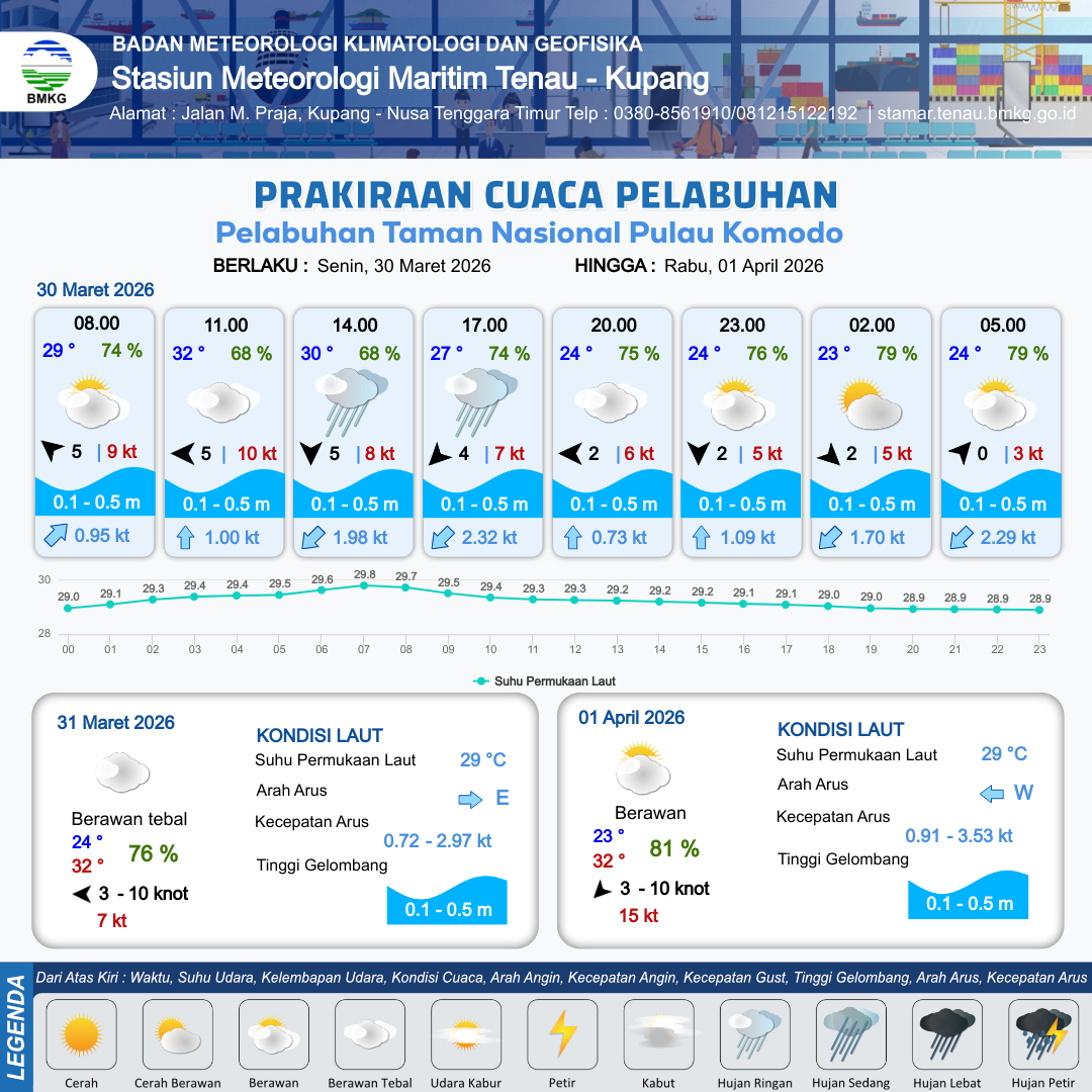 30 Mar 26, 09.00 2 jam kedepan | Timur Laut 4 kt Gust Peningkatan kecepatan angin yang singkat dan tiba-tiba : 7 kt | 0.3 m Tenang | Barat Daya 2.3 Knot | 8 km | 27 °C | 74 % | -0.39 m | |