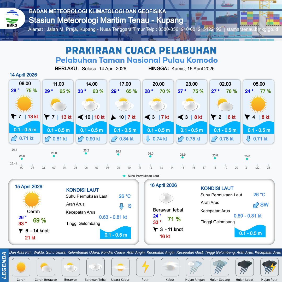 14 Apr 26, 23.00 10 jam kedepan | Tenggara 7 kt Gust Peningkatan kecepatan angin yang singkat dan tiba-tiba : 11 kt | 0.3 m Tenang | Selatan 0.6 Knot | 10 km | 26 °C | 78 % | +0.47 m |
