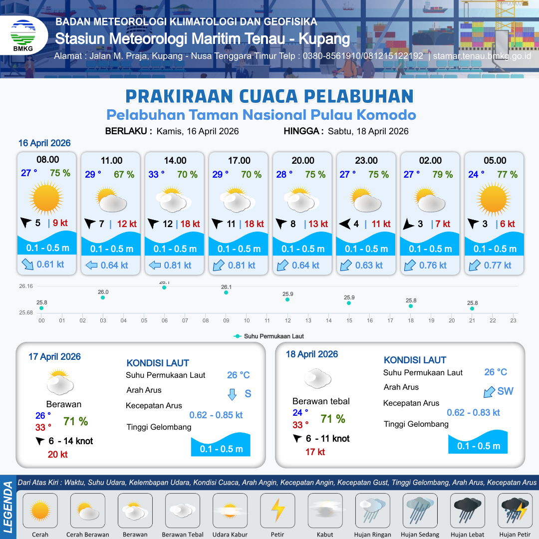 16 Apr 26, 08.00 5 jam kedepan | Tenggara 11 kt Gust Peningkatan kecepatan angin yang singkat dan tiba-tiba : 18 kt | 0.4 m Tenang | Barat Daya 0.8 Knot | 10 km | 30 °C | 69 % | +0.47 m | |