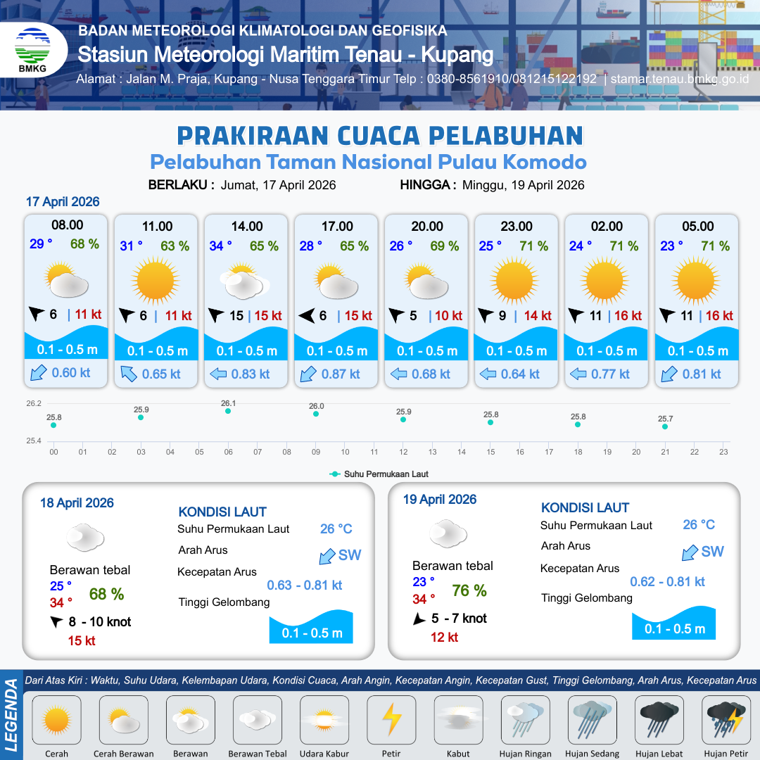 17 Apr 26, 08.00 5 jam kedepan | Timur 6 kt Gust Peningkatan kecepatan angin yang singkat dan tiba-tiba : 16 kt | 0.5 m Rendah | Barat Daya 0.9 Knot | 10 km | 30 °C | 64 % | +0.48 m | |