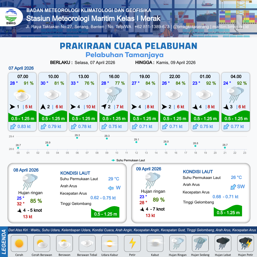7 Apr 26, 09.00 10 jam kedepan | Barat Daya 2 kt Gust Peningkatan kecepatan angin yang singkat dan tiba-tiba : 7 kt | 0.7 m Rendah | Barat Daya 0.8 Knot | 7 km | 28 °C | 77 % | +0.51 m | |