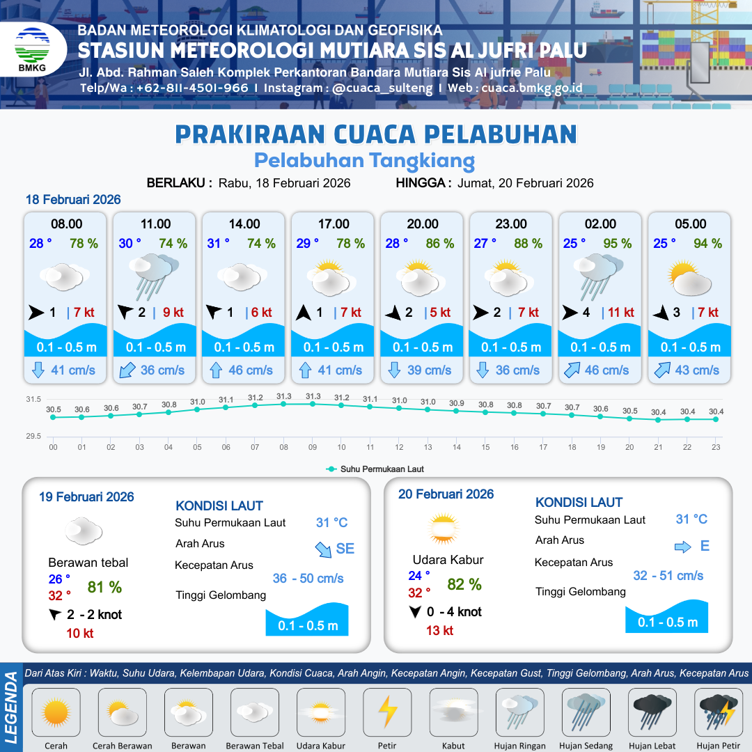 18 Feb 26, 09.00 12 jam kedepan | Selatan 2 kt Gust Peningkatan kecepatan angin yang singkat dan tiba-tiba : 6 kt | 0.1 m Tenang | Utara 36.0 cm/s | 10 km | 30 °C | 84 % | +0.51 m | |