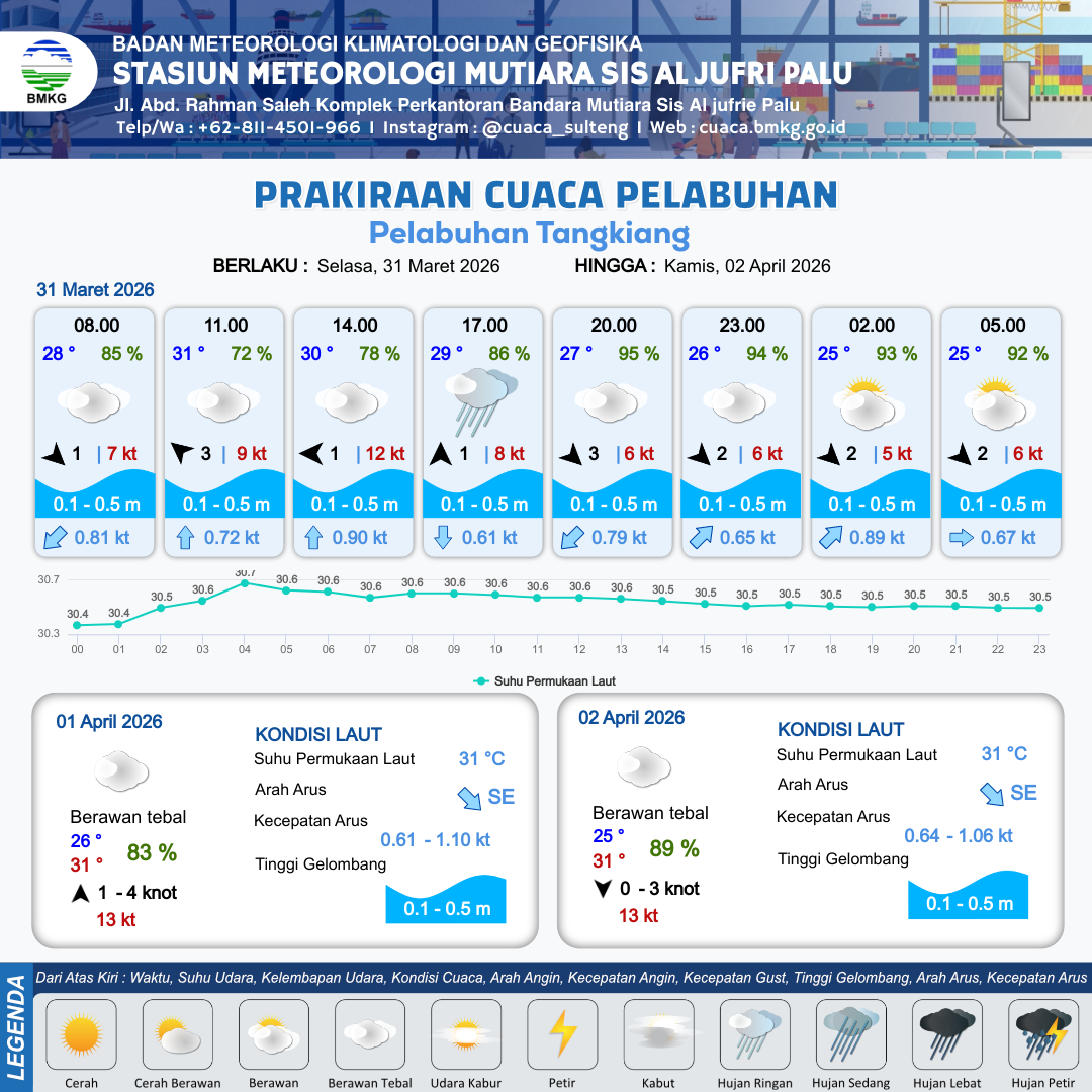 31 Mar 26, 06.00 12 jam yang lalu | Berawan Tebal | Timur 1 kt Gust Peningkatan kecepatan angin yang singkat dan tiba-tiba : 12 kt | | | 10 km | 30 °C | 78 % | +0.54 m |