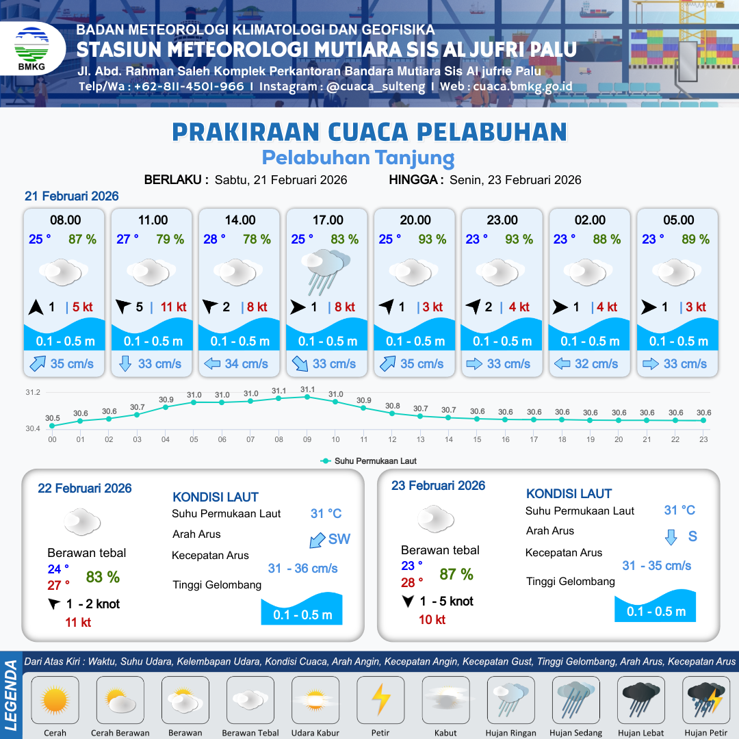 21 Feb 26, 21.00 2 jam kedepan | Berawan Tebal | Barat 1 kt Gust Peningkatan kecepatan angin yang singkat dan tiba-tiba : 3 kt | | | 10 km | 23 °C | 89 % | +0.68 m |