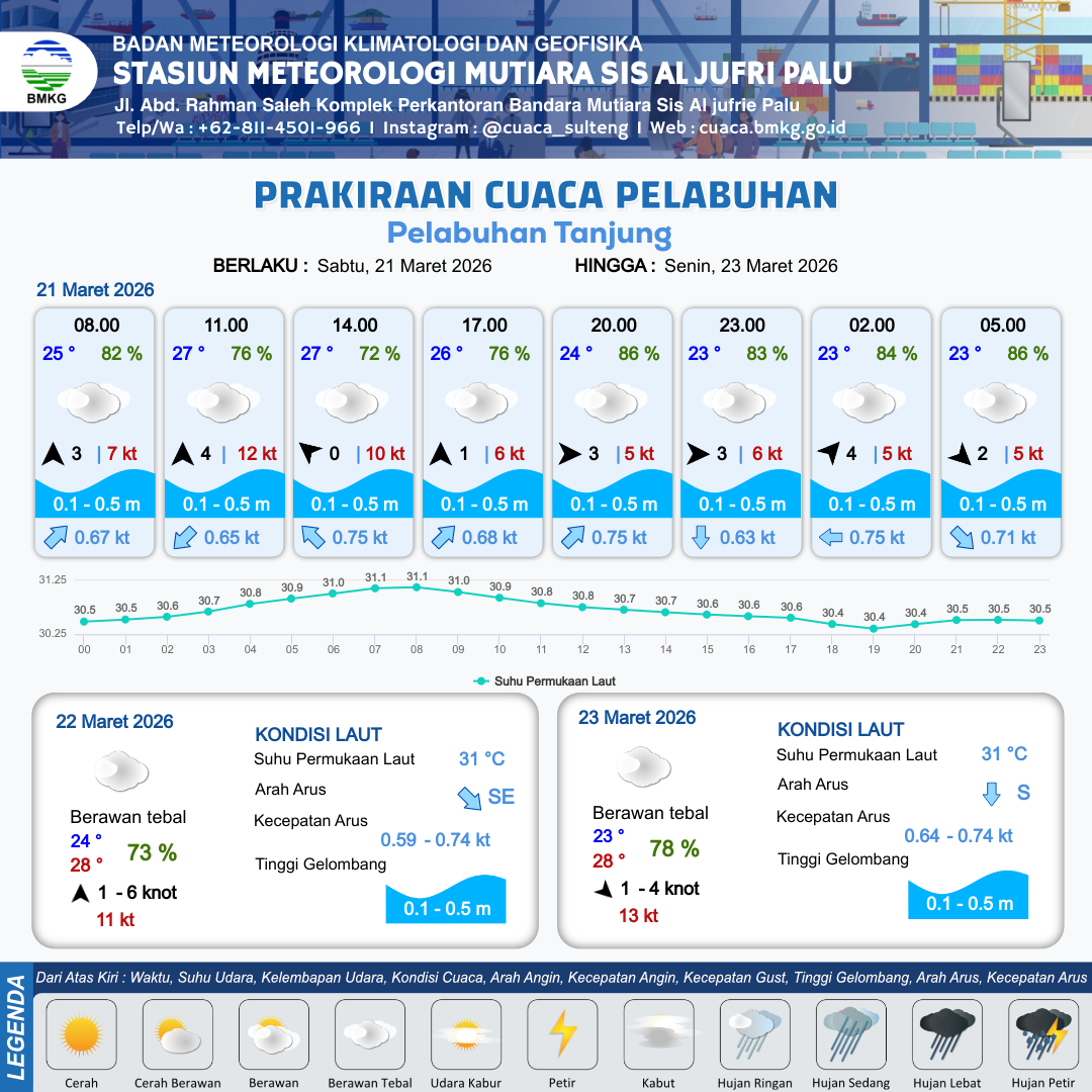 21 Mar 26, 10.00 Saat ini | Selatan 1 kt Gust Peningkatan kecepatan angin yang singkat dan tiba-tiba : 5 kt | 0.1 m Tenang | Utara 0.8 Knot | 9 km | 25 °C | 82 % | +0.22 m | |