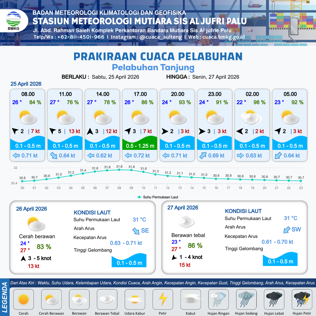 26 Apr 26, 07.00 2 jam kedepan | Tenggara 5 kt Gust Peningkatan kecepatan angin yang singkat dan tiba-tiba : 12 kt | 0.1 m Tenang | Barat Laut 0.7 Knot | 10 km | 27 °C | 75 % | -0.20 m | |