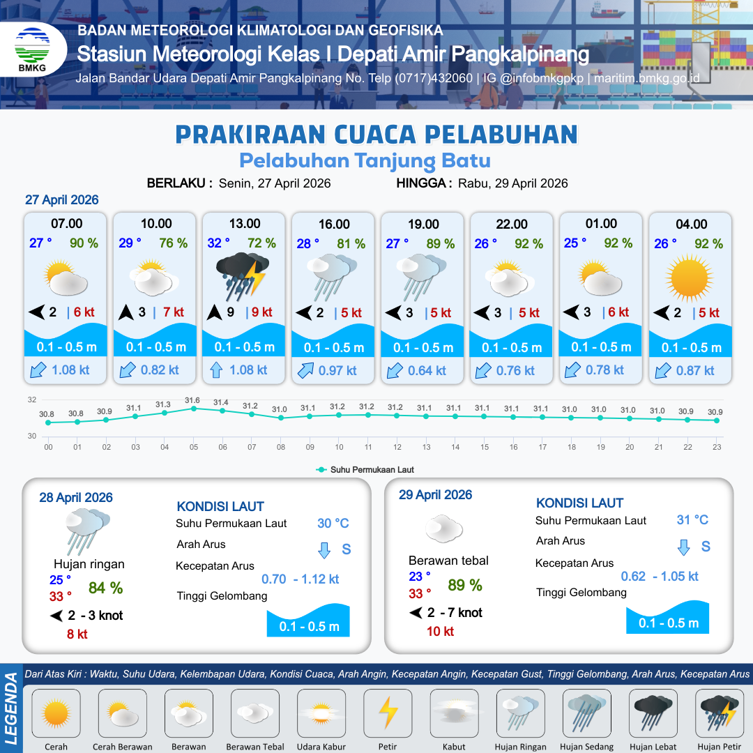 27 Apr 26, 12.00 4 jam kedepan | Timur 3 kt Gust Peningkatan kecepatan angin yang singkat dan tiba-tiba : 5 kt | 0.1 m Tenang | Utara 0.6 Knot | 7 km | 27 °C | 89 % | -0.54 m | |