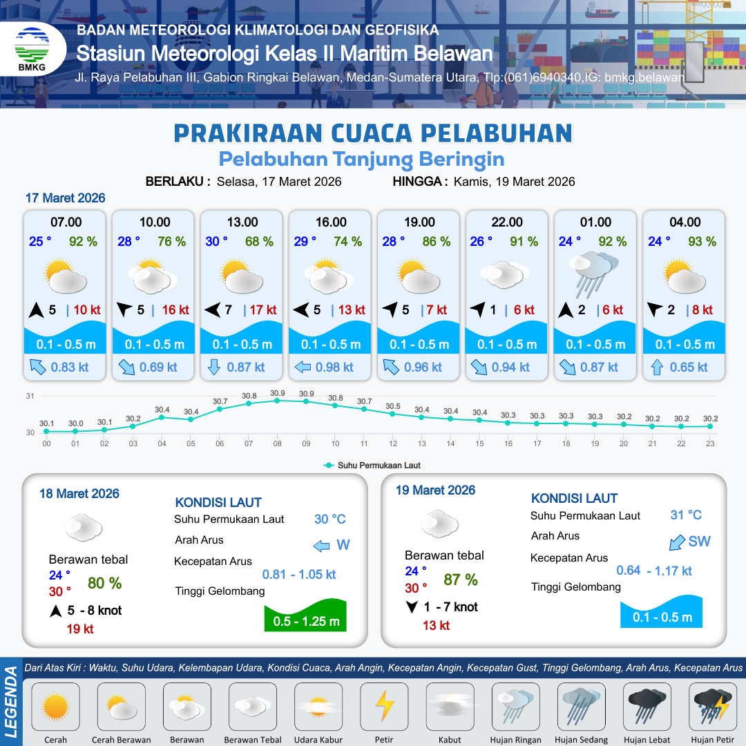 16 Mar 26, 06.00 15 jam yang lalu | Berawan | Timur Laut 6 kt Gust Peningkatan kecepatan angin yang singkat dan tiba-tiba : 13 kt | | | 10 km | 29 °C | 63 % | +0.67 m |