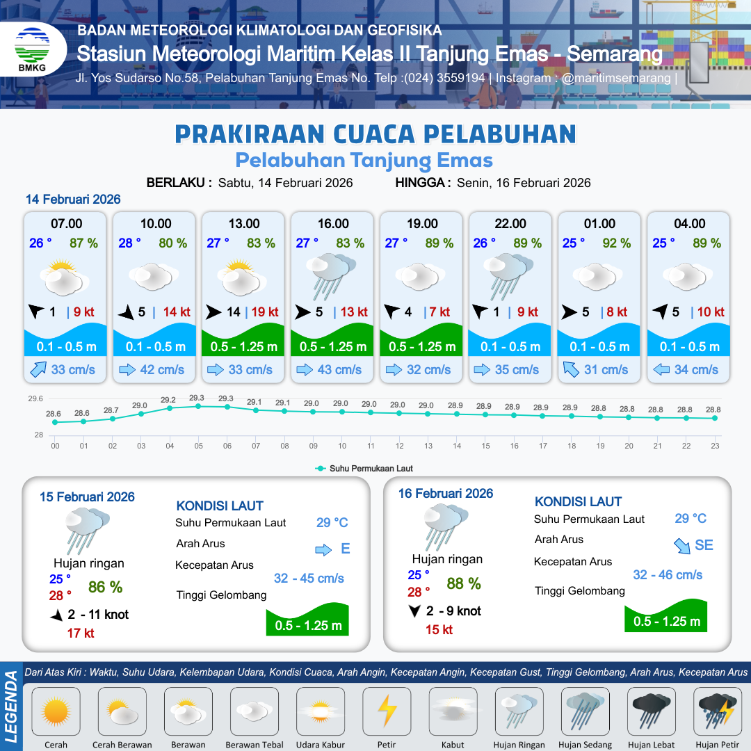 13 Feb 26, 07.00 13 jam yang lalu | Hujan Ringan | Barat 11 kt Gust Peningkatan kecepatan angin yang singkat dan tiba-tiba : 22 kt | | | 8 km | 29 °C | 85 % | -0.22 m |