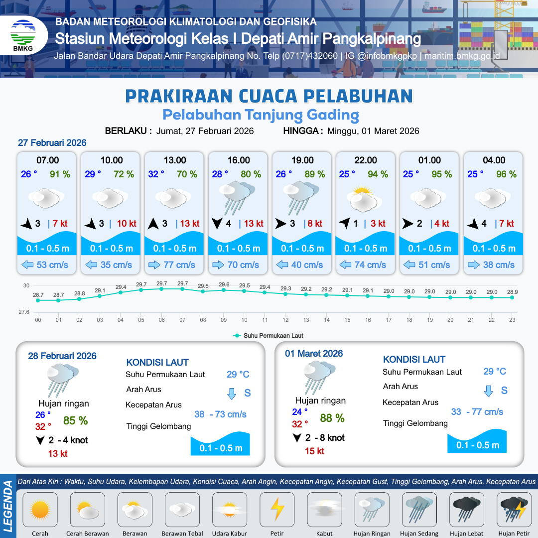 26 Feb 26, 22.00 2 jam kedepan | Berawan | Barat 4 kt Gust Peningkatan kecepatan angin yang singkat dan tiba-tiba : 7 kt | | | 10 km | 25 °C | 96 % | +0.39 m |
