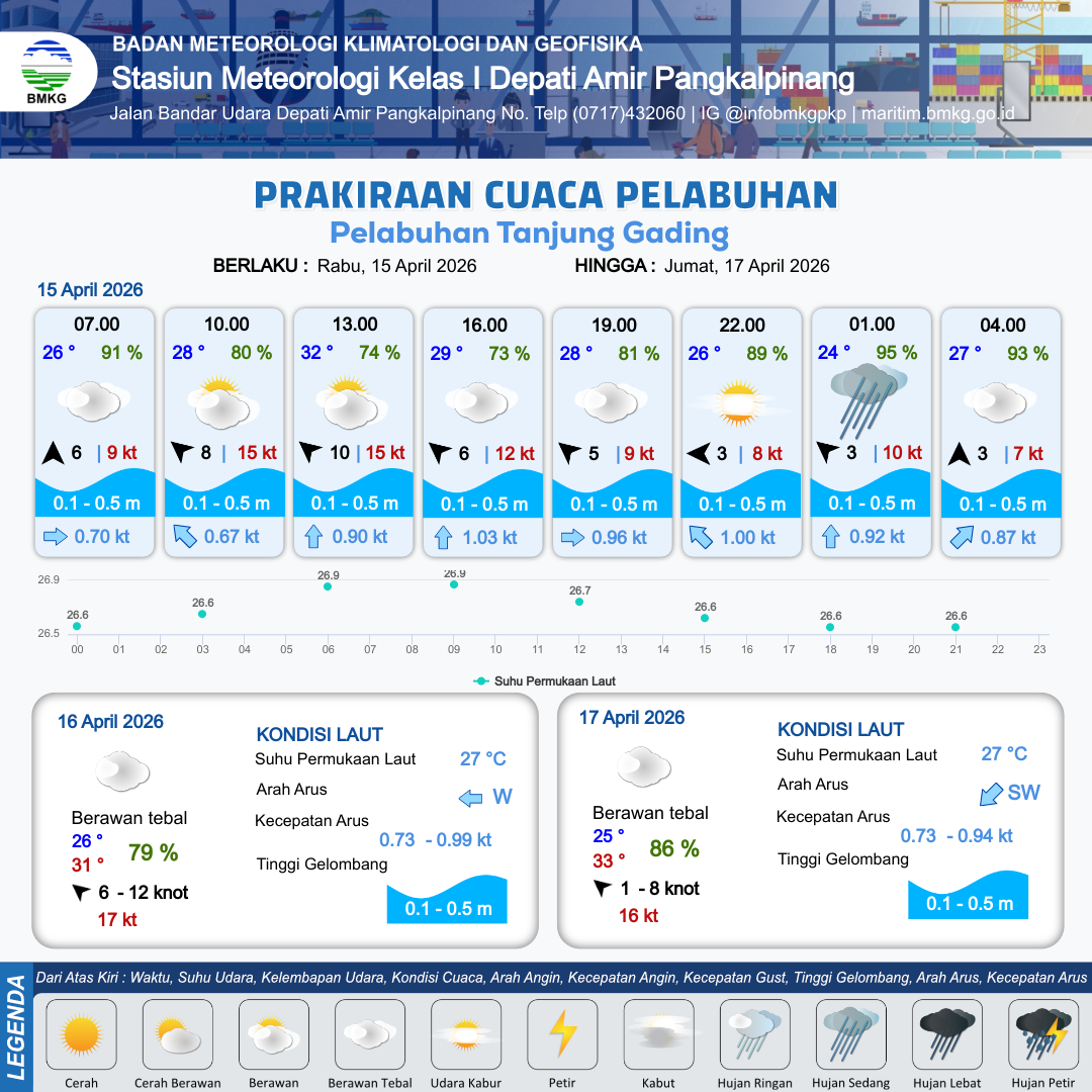 14 Apr 26, 16.00 4 jam yang lalu | Berawan Tebal | Selatan 7 kt Gust Peningkatan kecepatan angin yang singkat dan tiba-tiba : 4 kt | | | 10 km | 29 °C | 86 % | +0.59 m |