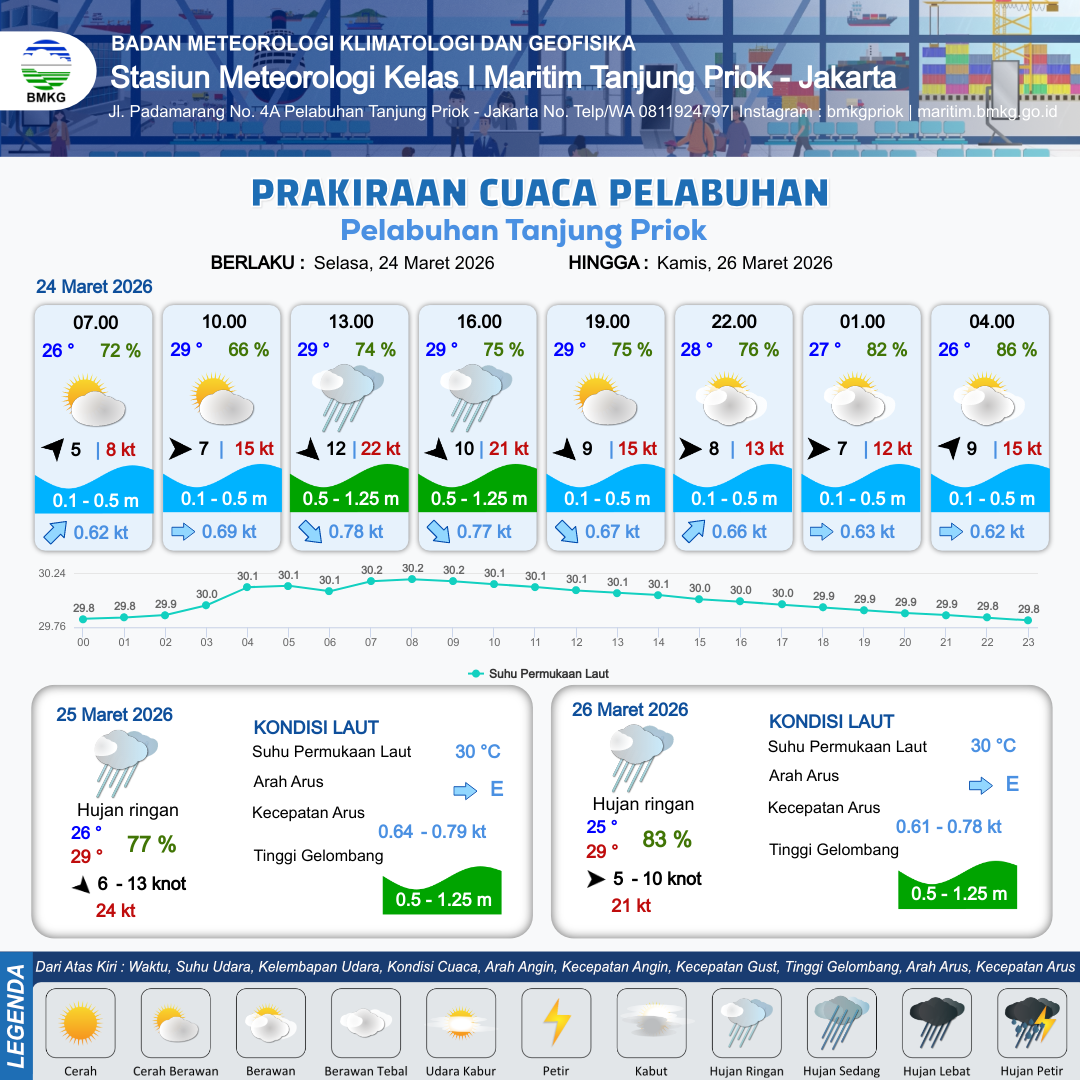 25 Mar 26, 12.00 3 jam kedepan | Barat 6 kt Gust Peningkatan kecepatan angin yang singkat dan tiba-tiba : 11 kt | 0.4 m Tenang | Selatan 0.6 Knot | 10 km | 29 °C | 72 % | +0.12 m | |