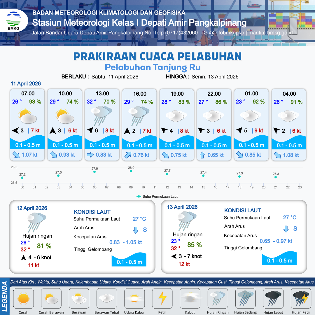10 Apr 26, 08.00 12 jam yang lalu | Hujan Ringan | Utara 2 kt Gust Peningkatan kecepatan angin yang singkat dan tiba-tiba : 8 kt | | | 10 km | 30 °C | 75 % | +0.56 m |