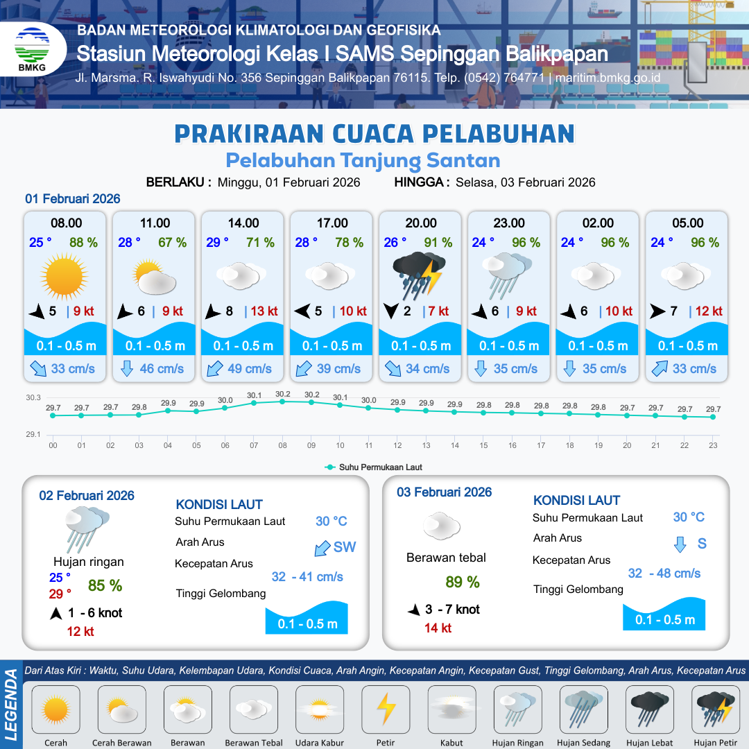1 Feb 26, 23.00 3 jam kedepan | Berawan Tebal | Barat Laut 6 kt Gust Peningkatan kecepatan angin yang singkat dan tiba-tiba : 13 kt | | | 10 km | °C | 96 % | +0.22 m |