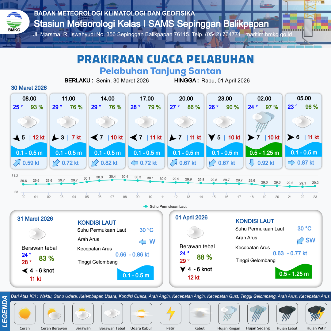 30 Mar 26, 08.00 4 jam kedepan | Timur 7 kt Gust Peningkatan kecepatan angin yang singkat dan tiba-tiba : 12 kt | 0.4 m Tenang | Barat 0.8 Knot | 10 km | 29 °C | 78 % | +0.56 m | |