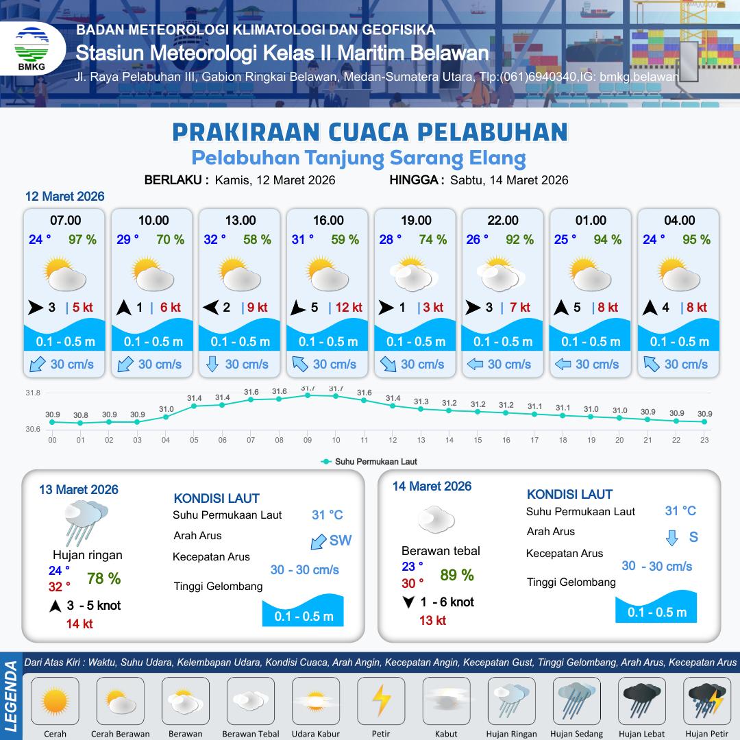 12 Mar 26, 08.00 6 jam kedepan | Timur Laut 5 kt Gust Peningkatan kecepatan angin yang singkat dan tiba-tiba : 10 kt | 0.1 m Tenang | Utara 30.0 cm/s | 10 km | 32 °C | 57 % | +0.04 m | |