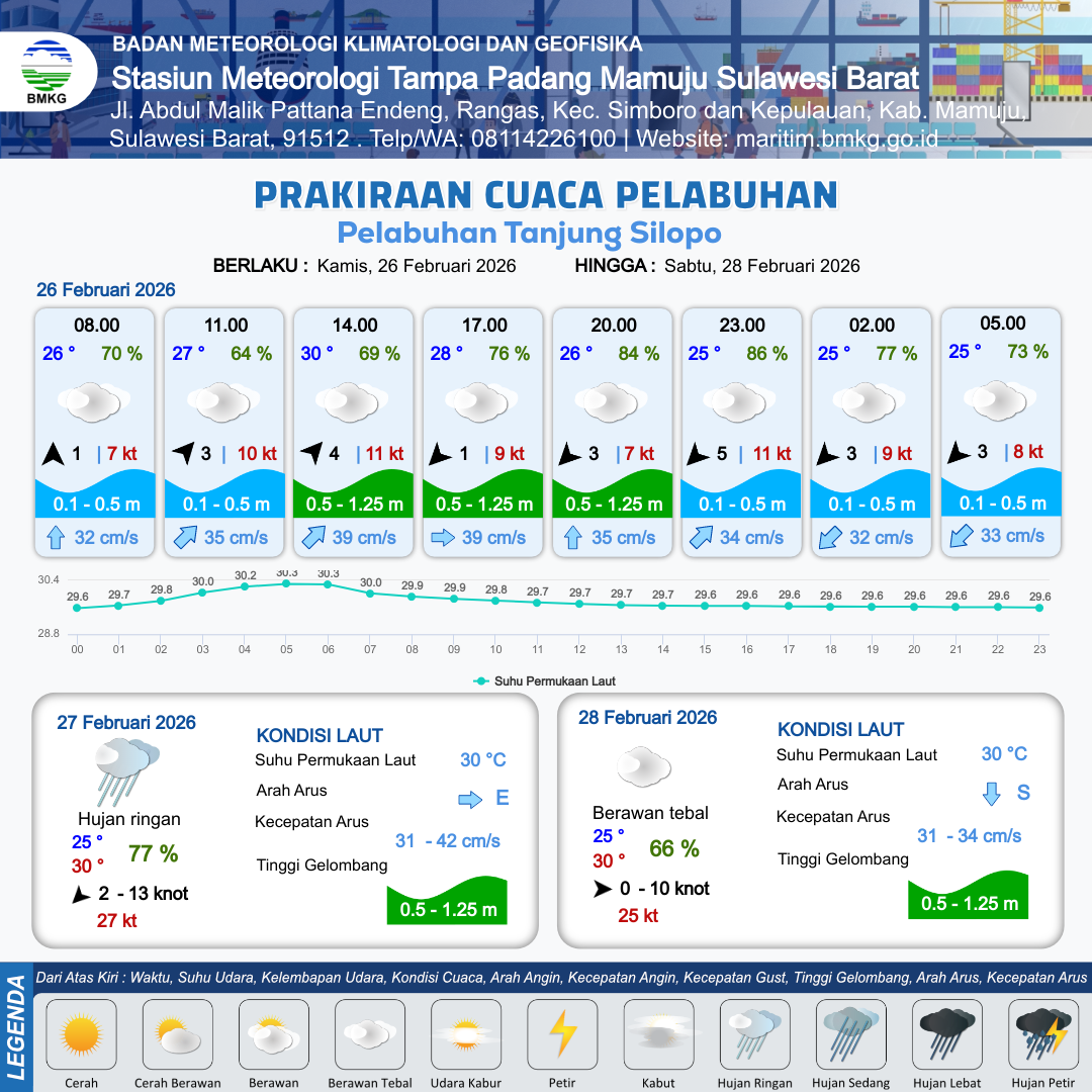 26 Feb 26, 06.00 6 jam kedepan | Barat Daya 4 kt Gust Peningkatan kecepatan angin yang singkat dan tiba-tiba : 11 kt | 1 m Rendah | Timur Laut 39.0 cm/s | 9 km | 30 °C | 69 % | +0.02 m | |