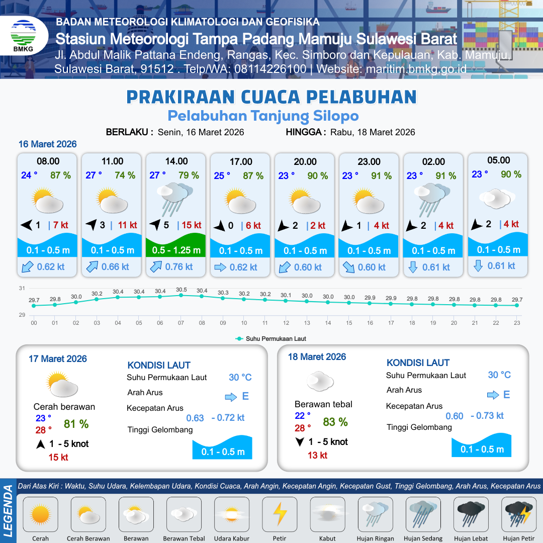 16 Mar 26, 02.00 3 jam kedepan | Barat Daya 3 kt Gust Peningkatan kecepatan angin yang singkat dan tiba-tiba : 12 kt | 0.2 m Tenang | Timur Laut 0.6 Knot | 10 km | 27 °C | 74 % | +0.17 m | |