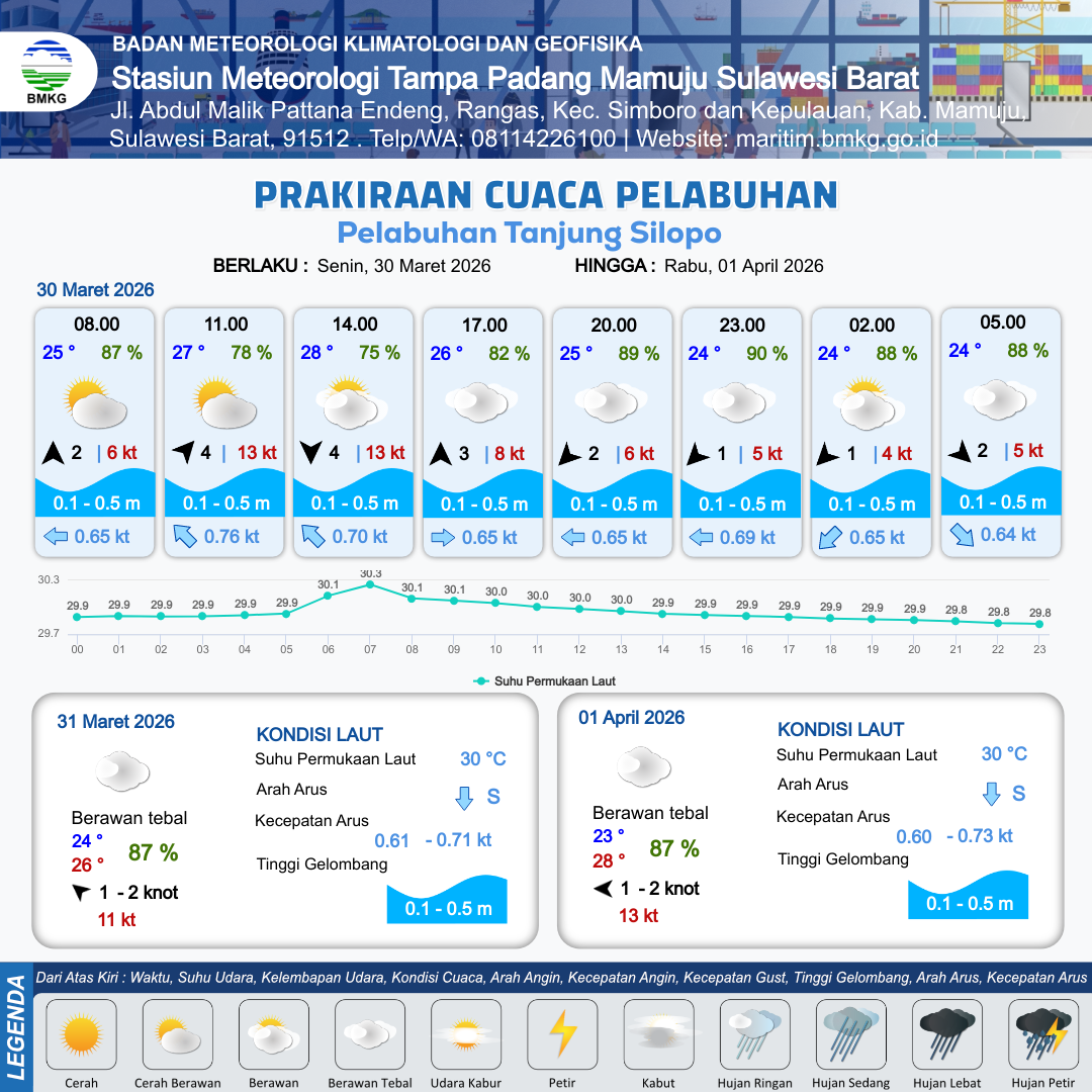 30 Mar 26, 03.00 2 jam kedepan | Barat Daya 4 kt Gust Peningkatan kecepatan angin yang singkat dan tiba-tiba : 13 kt | 0.2 m Tenang | Barat Laut 0.8 Knot | 10 km | 27 °C | 78 % | +0.25 m | |