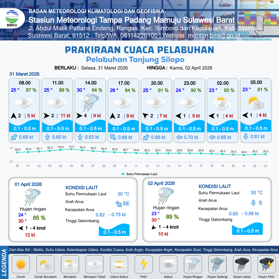 31 Mar 26, 03.00 2 jam kedepan | Barat 2 kt Gust Peningkatan kecepatan angin yang singkat dan tiba-tiba : 11 kt | 0.1 m Tenang | Utara 0.6 Knot | 9 km | 25 °C | 89 % | +0.14 m | |