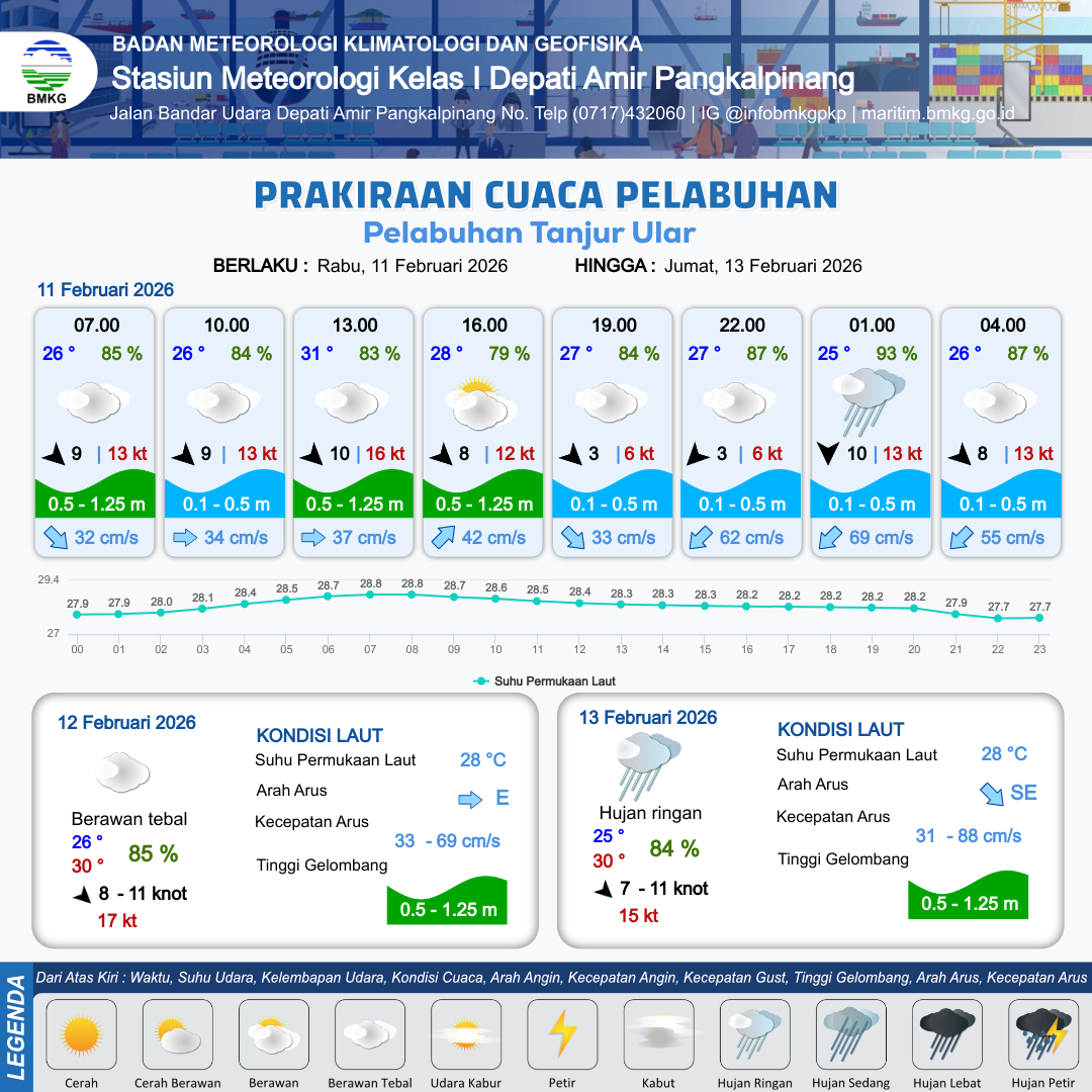 11 Feb 26, 22.00 4 jam kedepan | Berawan Tebal | Barat Laut 8 kt Gust Peningkatan kecepatan angin yang singkat dan tiba-tiba : 13 kt | | | 10 km | 26 °C | 87 % | +1.32 m |
