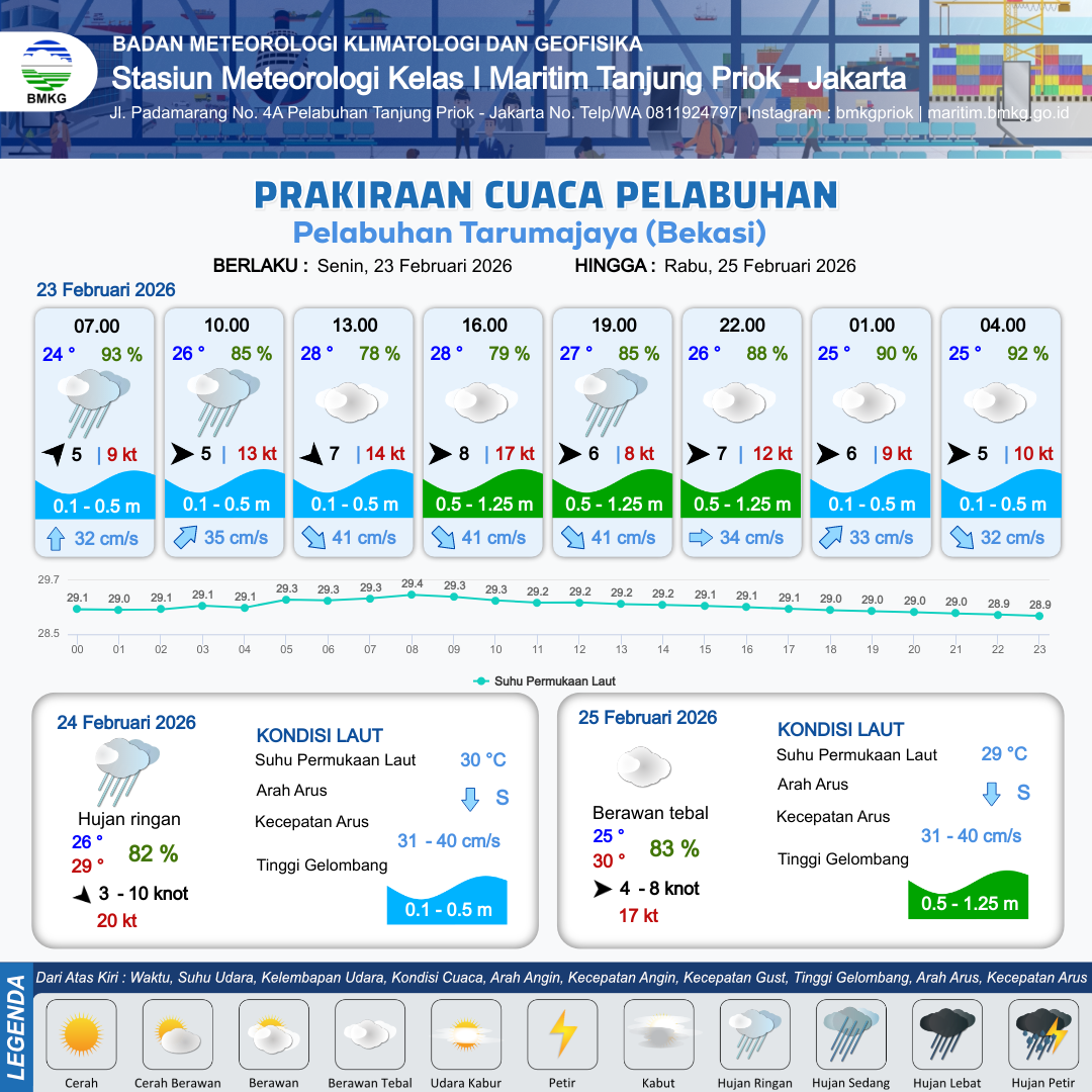 23 Feb 26, 21.00 4 jam kedepan | Barat 5 kt Gust Peningkatan kecepatan angin yang singkat dan tiba-tiba : 10 kt | 0.3 m Tenang | Tenggara 32.0 cm/s | 8 km | 25 °C | 92 % | +0.24 m | |