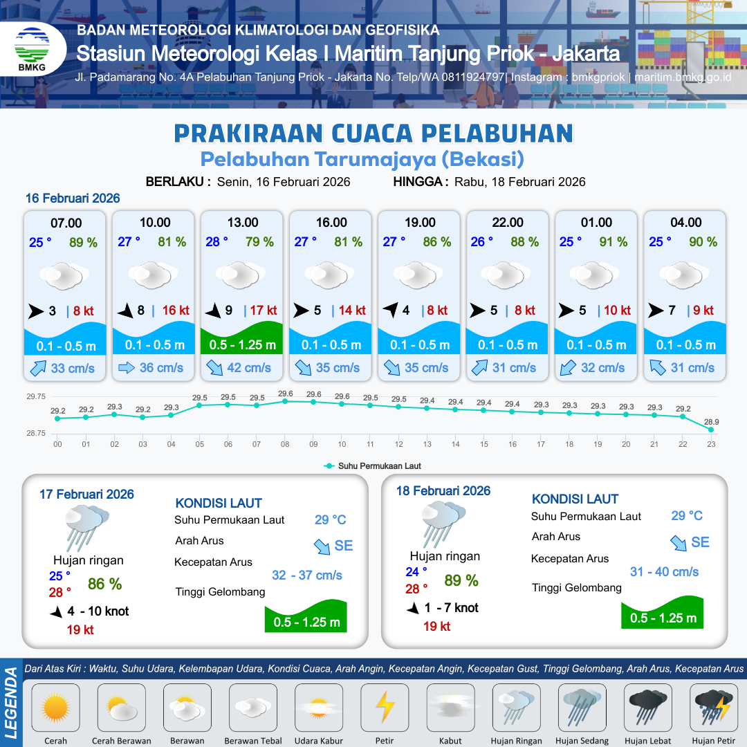 16 Feb 26, 15.00 2 jam kedepan | Barat 5 kt Gust Peningkatan kecepatan angin yang singkat dan tiba-tiba : 8 kt | 0.4 m Tenang | Timur Laut 31.0 cm/s | 10 km | 26 °C | 88 % | -0.20 m | |