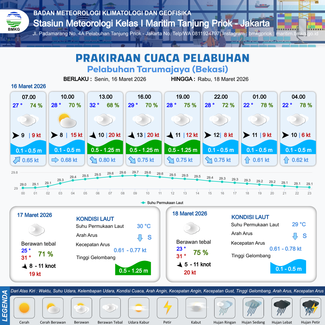 16 Mar 26, 16.00 2 jam kedepan | Barat 12 kt Gust Peningkatan kecepatan angin yang singkat dan tiba-tiba : 11 kt | 0.3 m Tenang | Utara 0.6 Knot | 10 km | 28 °C | 72 % | +0.15 m | |