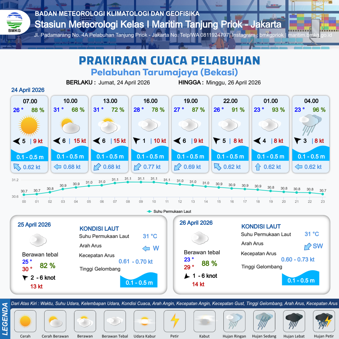 23 Apr 26, 21.00 24 jam kedepan | Tenggara 2 kt Gust Peningkatan kecepatan angin yang singkat dan tiba-tiba : 4 kt | 0.1 m Tenang | Barat 0.6 Knot | 10 km | 24 °C | 96 % | +0.32 m | |