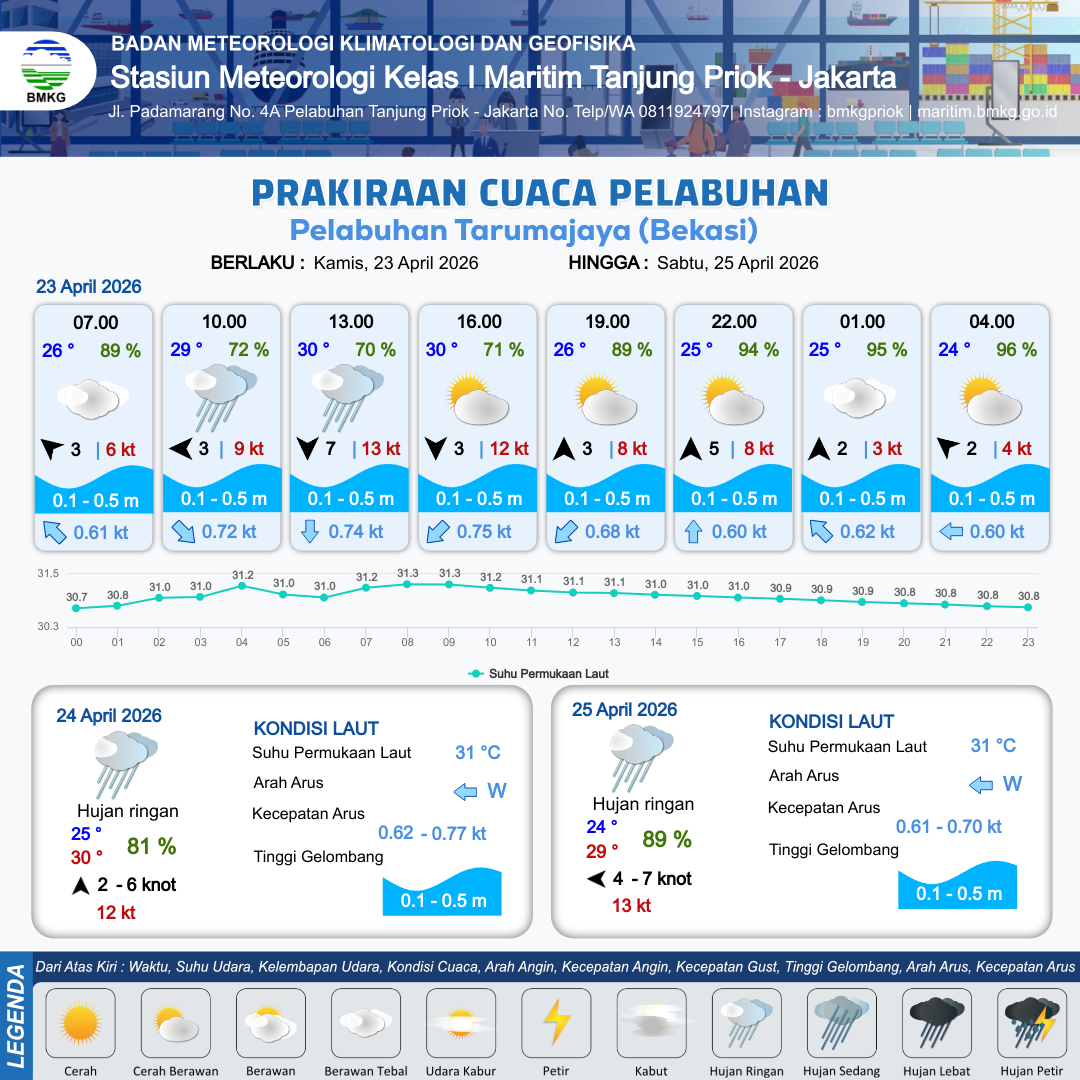 23 Apr 26, 02.00 18 jam kedepan | Timur 3 kt Gust Peningkatan kecepatan angin yang singkat dan tiba-tiba : 9 kt | 0.1 m Tenang | Utara 0.6 Knot | 10 km | 28 °C | 76 % | -0.20 m | |