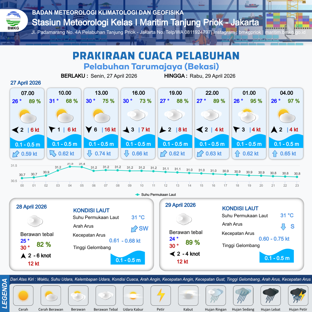 27 Apr 26, 05.00 5 jam kedepan | Utara 6 kt Gust Peningkatan kecepatan angin yang singkat dan tiba-tiba : 12 kt | 0.2 m Tenang | Selatan 0.8 Knot | 8 km | 31 °C | 70 % | -0.01 m | |