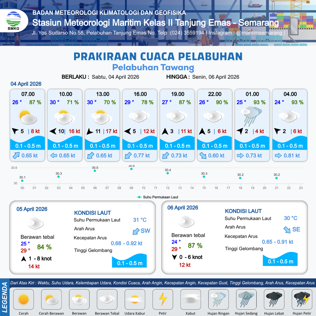 4 Apr 26, 12.00 2 jam kedepan | Selatan 3 kt Gust Peningkatan kecepatan angin yang singkat dan tiba-tiba : 11 kt | 0.3 m Tenang | Barat Daya 0.7 Knot | 7 km | 27 °C | 87 % | +0.67 m | |