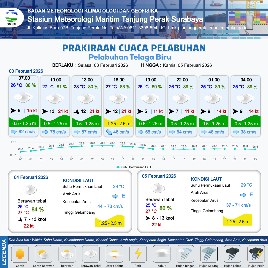 3 Feb 26, 23.00 6 jam kedepan | Berawan Tebal | Barat 7 kt Gust Peningkatan kecepatan angin yang singkat dan tiba-tiba : 13 kt | | | 10 km | 25 °C | 89 % | -0.37 m |