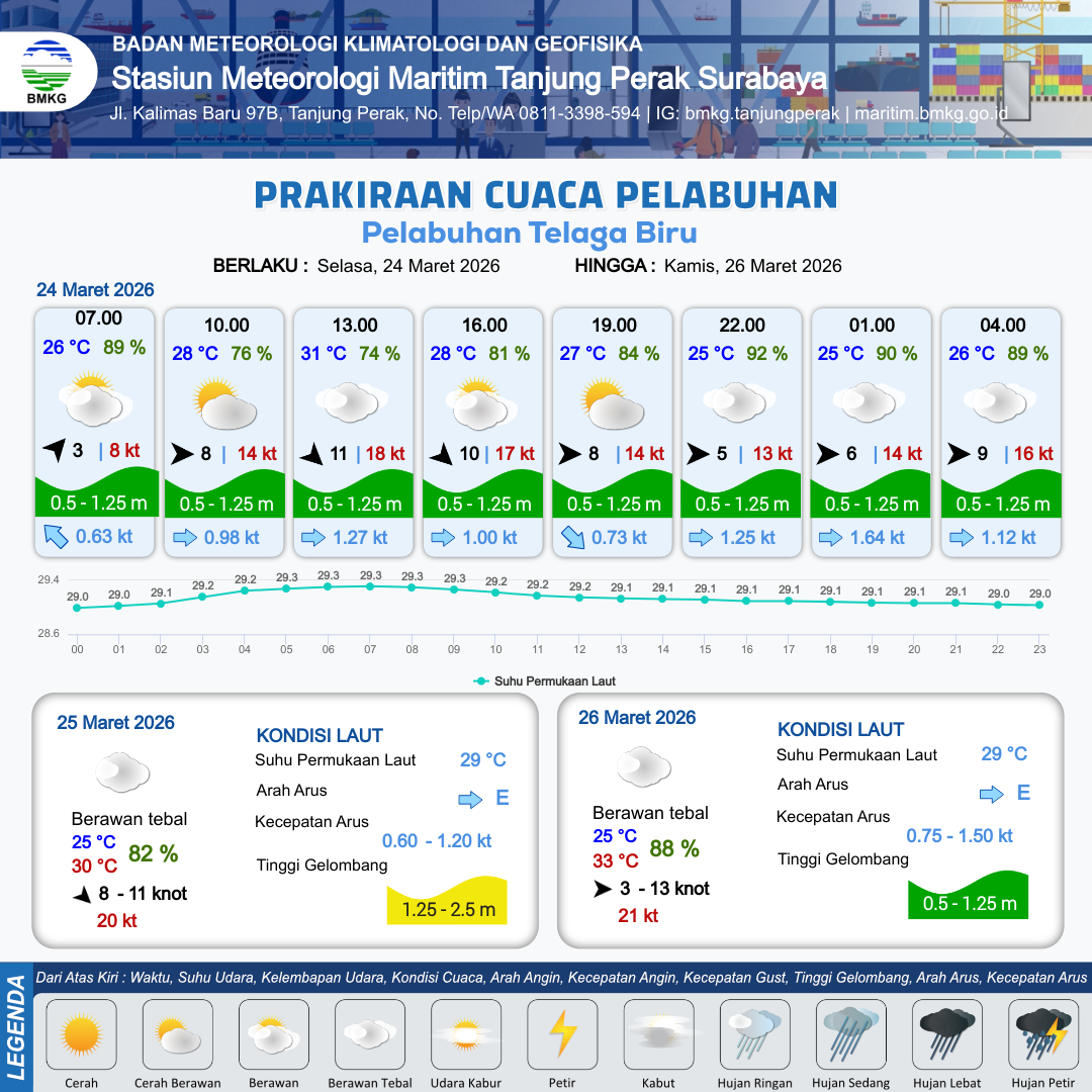 24 Mar 26, 22.00 24 jam kedepan | Barat 9 kt Gust Peningkatan kecepatan angin yang singkat dan tiba-tiba : 15 kt | 0.8 m Rendah | Timur 0.9 Knot | 10 km | 26 °C | 88 % | -0.36 m | |