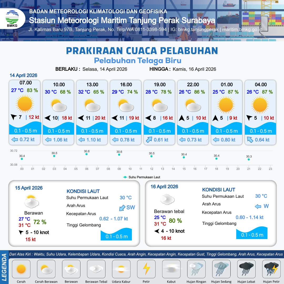 13 Apr 26, 04.00 16 jam yang lalu | Cerah Berawan | Timur 7 kt Gust Peningkatan kecepatan angin yang singkat dan tiba-tiba : 12 kt | | | 10 km | 30 °C | 72 % | +0.54 m |