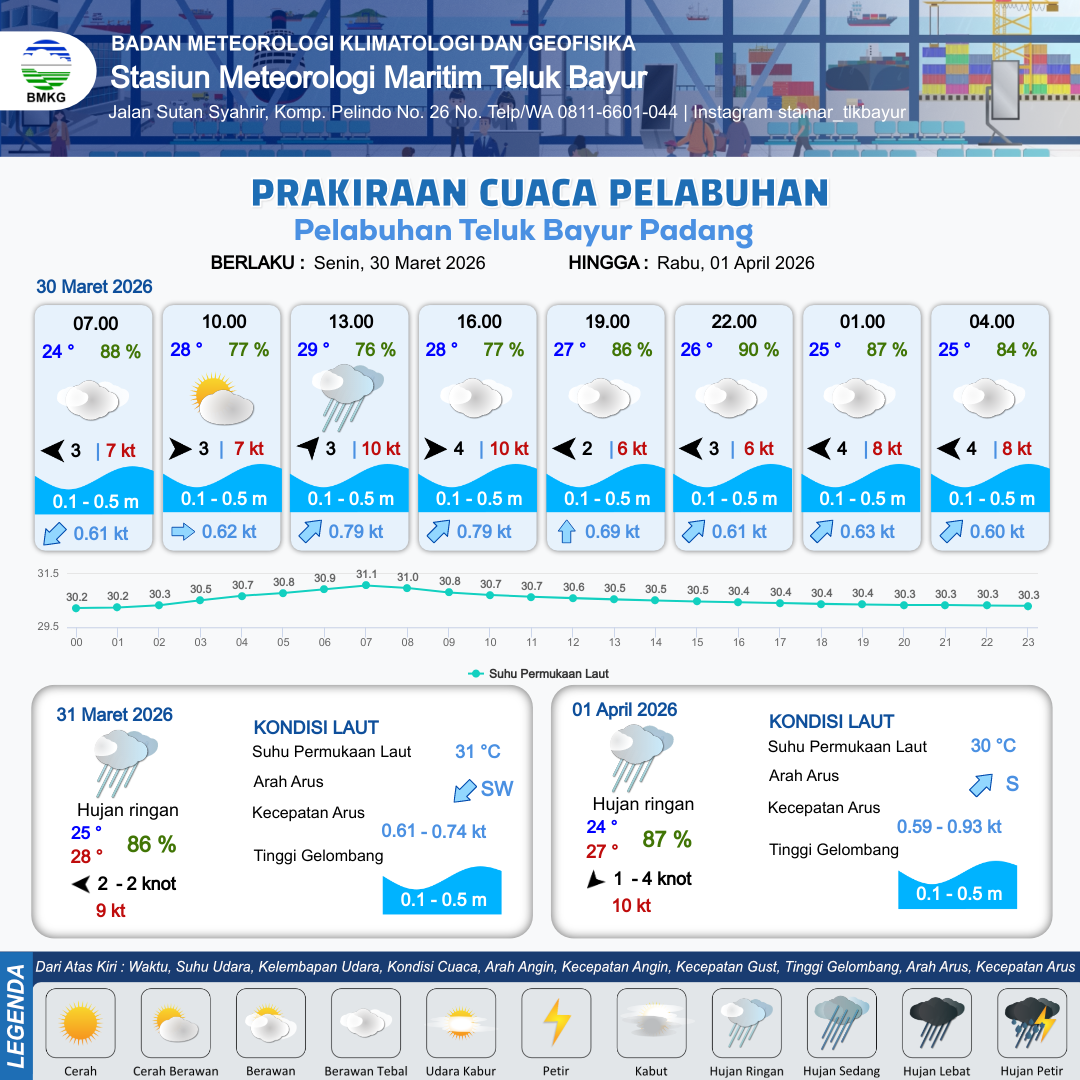 30 Mar 26, 08.00 10 jam yang lalu | Berawan Tebal | Barat 4 kt Gust Peningkatan kecepatan angin yang singkat dan tiba-tiba : 8 kt | | | 10 km | 29 °C | 76 % | +0.37 m |