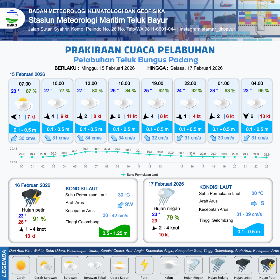 15 Feb 26, 06.00 13 jam yang lalu | Berawan Tebal | Barat Laut 2 kt Gust Peningkatan kecepatan angin yang singkat dan tiba-tiba : 8 kt | | | 8 km | 27 °C | 80 % | -0.15 m |