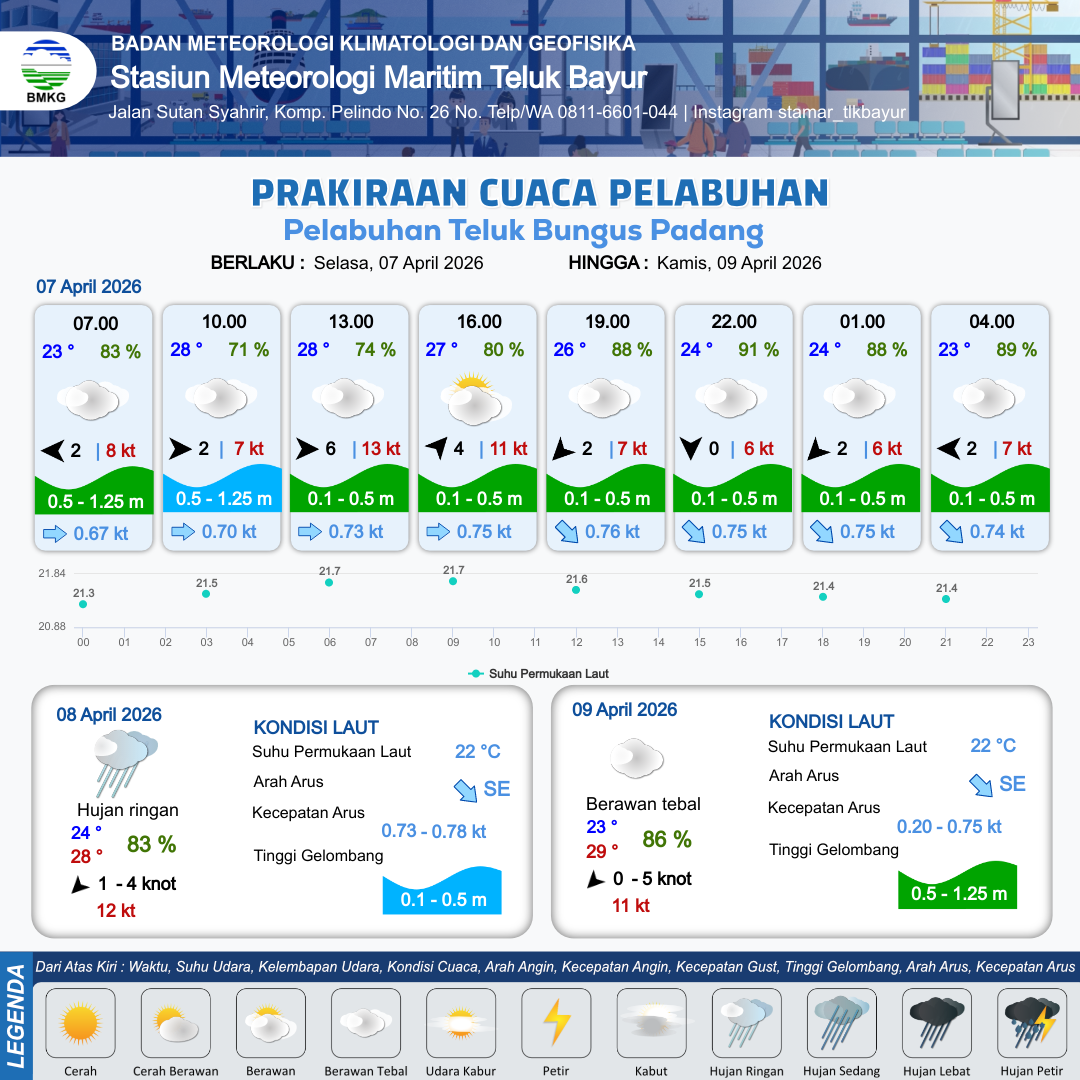 6 Apr 26, 22.00 3 jam kedepan | Berawan Tebal | Timur Laut 2 kt Gust Peningkatan kecepatan angin yang singkat dan tiba-tiba : 8 kt | | | 8 km | 22 °C | 91 % | +0.35 m |